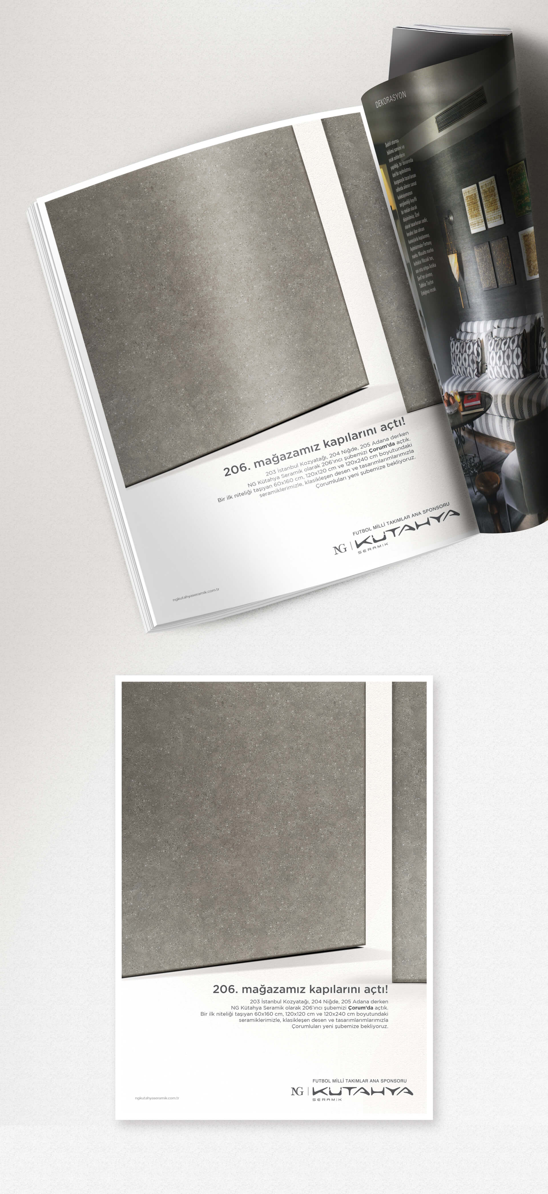 NG Kütahya Seramik’in yeni açılan mağazasının iletişimini sağlamak için yaptığımız dergi ilanında, markanın kendi ürününe metaforik bir anlam katarken dingin ses tonunu, ilanın grafik diline taşıdık.